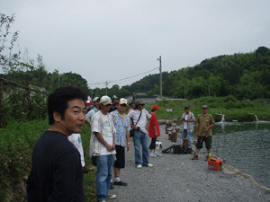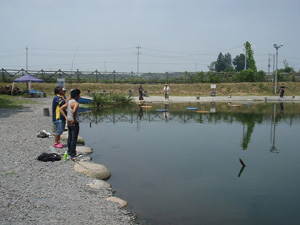 ブースに戻ってみたら福島から来たというお客さんがいてクラピーを買ってくれたので、釣り場でフラットクラピーSRの引き方を伝授。